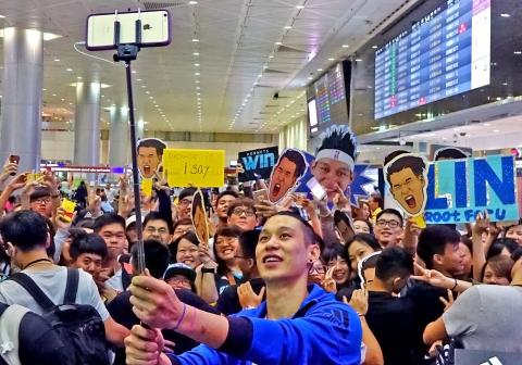 Lin was greeted by more than 200 fans on his arrival at the Taiwan Taoyuan International Airport early yesterday morning. Apart from giving autographs, Lin took selfies with his fans and gave away autographed caps and T-shirts.