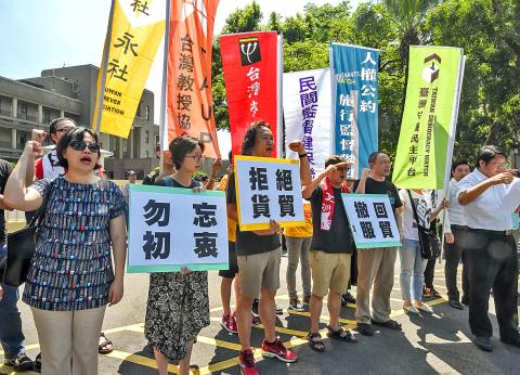 The government should withdraw a proposed service trade agreement with China and halt negotiations over a trade in goods agreement, civil campaigners yesterday said during a protest outside the Executive Yuan building, ahead of the third anniversary of the signing of the service trade pact today.