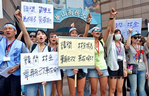 While Ho met with flight attendants demonstrating in front of China Airlines’ headquarters in Taipei, a small group of the airline’s flight attendants, mostly from Kaohsiung, staged another demonstration outside the Democratic Progressive Party’s (DPP) headquarters in the capital.