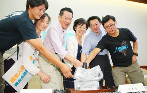 Members of Covenants Watch, the Taiwan Association for Human Rights and other groups joined Democratic Progressive Party (DPP) legislators Yu Mei-nu (尤美女) and Wellington Koo (顧立雄) at an event at which they used a hammer to smash open two blocks of ice containing pieces of paper representing legislation to create the commission, which they said has been “frozen” since being proposed by former president Chen Shui-bian (陳水扁) due to Chinese Nationalist Party (KMT) opposition.
