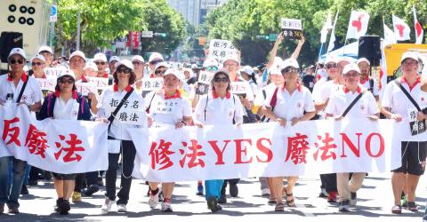 About 300 members from the society’s chapters nationwide participated in the protest, with some coming from Hualien and outlying Kinmen county.