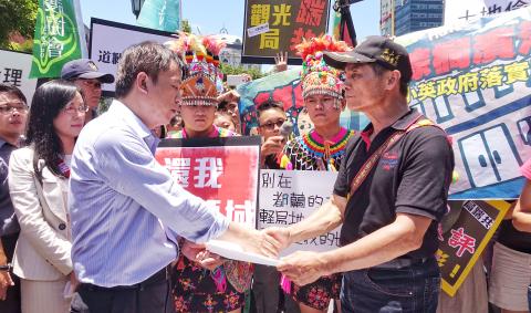 Following an hour-long standoff, Executive Yuan Deputy Secretary-General Shih Keh-he (施克和) met with protesters to accept their petition, saying that the hotel project could not be approved without the consent of Aboriginal communities.