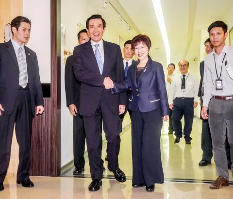 KMT Chairwoman Hung Hsiu-chu (洪秀柱) arrived at the ceremony 20 minutes before Ma and met briefly with the former president before his speech.
