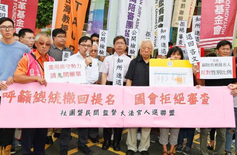 Earlier yesterday, the groups alleged that Hsieh had wilfully concealed his role in those cases in the resume he submitted to the legislature and demanded that President Tsai Ing-wen (蔡英文) rescind the nomination, or for the legislature to refuse to vote for his confirmation if she was unable or unwilling to do so.