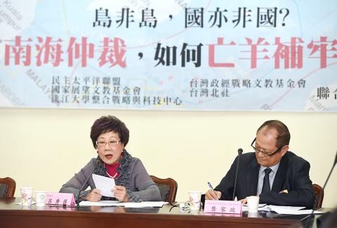 Former vice president Annette Lu (呂秀蓮) yesterday urged President Tsai Ing-wen (蔡英文) to file a case at the International Tribunal for the Law of the Sea with regard to the nation’s rights over islands in the South China Sea, while calling on the ruling and opposition parties to initiate a name-rectification movement for the nation.
