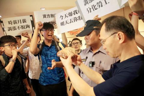 About a dozen young people from a range of labor groups, including the Taiwan Higher Education Union, the Workers’ Struggle Alliance and the Taiwan International Workers’ Association, protested in the foyer outside the federation’s offices. They had an altercation with federation officials before police officers arrived and the officials closed the doors.