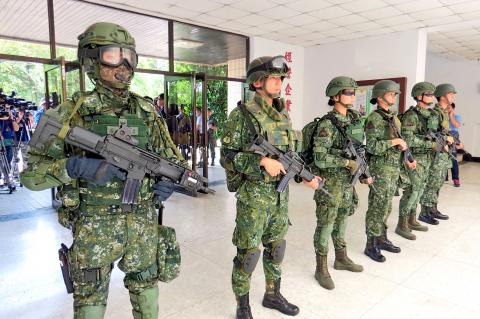 As part of the tour, Ma Shu-jung (馬樹榮), head of the research and development division of the Armament Bureau’s 205th Armory, displayed military kit and personal equipment it has developed.