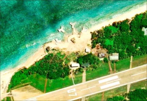 Four three-pronged structures were visible on the northwestern coast of Itu Aba Island (Taiping Island, 太平島) after the imagery was updated in July, but the ministry and the Coast Guard Administration have not commented on their nature.
