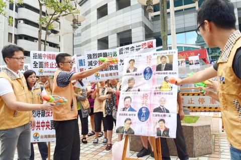 The TSU protesters splashed red ink on photographs of the eight delegation members, while KMT members staging a counterprotest shouted slogans against the Democratic Progressive Party (DPP).