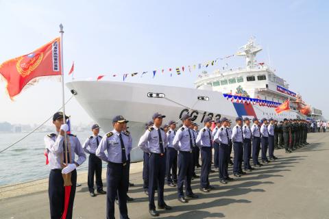 “As a maritime nation, we particularly need to invest resources in patrolling and defending coastal borders,” Tsai said at Kaohsiung Harbor at the commissioning of the Coast Guard Administration’s new 1,000-tonne patrol vessels, the Taitung CG-133 (台東艦) and the Pingtung CG-135 (屏東艦).