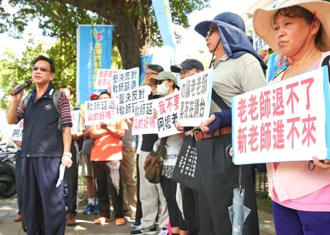 The National Federation of Education Unions yesterday rallied outside the Ministry of Education in Taipei to protest a proposal by Democratic Progressive Party Legislator Wang Jung-chang (王榮璋) to push back the legal retirement age for teachers to 65.