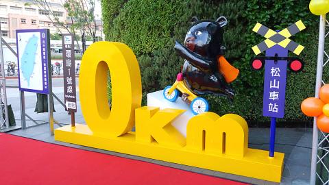 A “0 kilometer” marker was yesterday unveiled at Taipei’s Songshan Railway Station (松山車站) as the starting point of Cycling Route No. 1 (自行車環島1號線) — the nation’s first round-the-island cycling route launched in December last year.