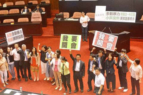 They held up banners and shouted: “The KMT will not bow to the DPP’s fists,” “[We are] against tyranny of the majority and refuse condescending negotiations” and “The meeting is invalid and the review [should be] redone.”