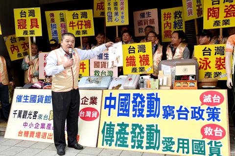 The heads of small and medium-sized enterprises (SME’s) demonstrated outside the legislature in Taipei yesterday, calling for people to buy more Taiwan-made products to boost the economy and urging the government to set up sale centers to promote businesses.