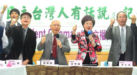 Former vice president Annette Lu (呂秀蓮) and pro-independence activists yesterday protested against US President Barack Obama after he described Taiwan as an “entity,” reiterating Taiwan’s statehood after a discussion about the nation’s image in mainstream US politics.