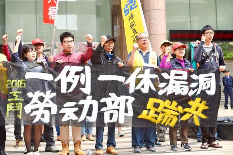 A coalition of workers’ unions staged a protest in front of the Ministry of Labor in Taipei, demanding that the ministry address loopholes in the scheme that have caused workers’ leave time and overtime pay to be cut.