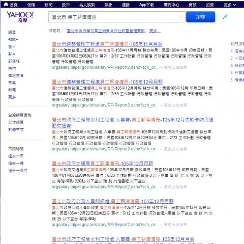 The information, which was leaked to Yahoo Taiwan’s search engine, included the names, pay grades, salaries and bank accounts of employees at the Department of Transportation, the Construction Management Office, the Department of Civil Servant Development and the Hydraulic Engineering Office.