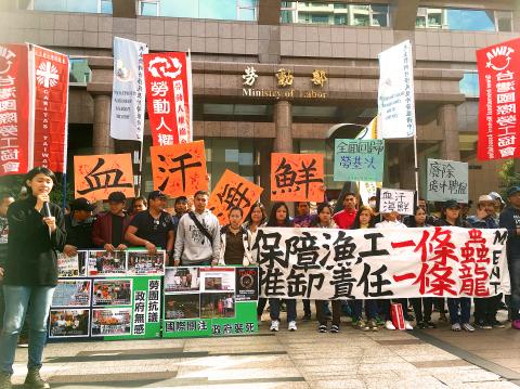 Members of the Taiwan International Workers’ Association protested in front of the Ministry of Labor in Taipei on Tuesday, demanding that fishery workers hired overseas be protected by the Labor Standards Act (勞動基準法).