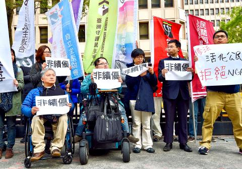 “There are numerous groups which have been suffering from the current law, so it is good that they are considering changes and asking for opinions, but we are bewildered as to why only groups graded as ‘excellent’ were invited,” Taiwan Association for Human Rights secretary-general Chiu E-ling (邱伊翎) said, adding that her group was rejected on grounds that a ministry review had not given it an “excellent” grade.