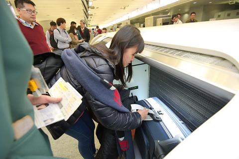 Three Japanese travelers were yesterday unable to check in their luggage after the Taiwan Taoyuan International Airport Mass Rapid Transit (MRT) line’s self-service baggage check system at Taipei Main Station encountered a system error, Taoyuan International Airport Corp said.