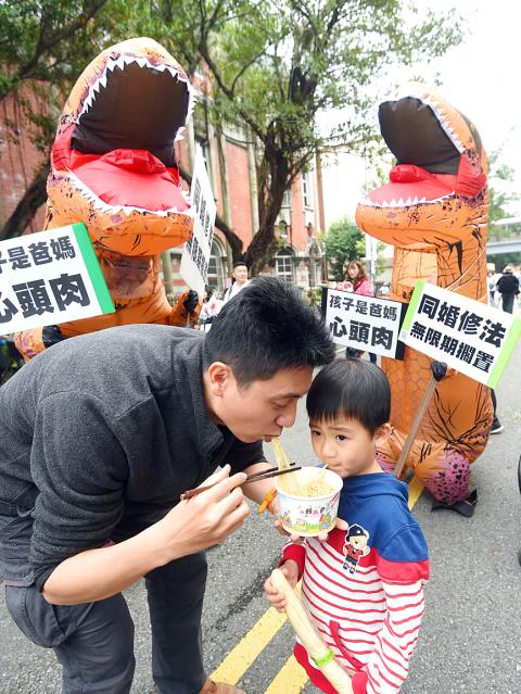 While protesters called themselves “a million old geezers” in support of anti-same sex marriage columnist Tseng Yu-wen (曾有文), most were parents accompanied by their children, many of whom had their pictures taken with the several protesters in inflatable dinosaur costumes who wandered around the site.