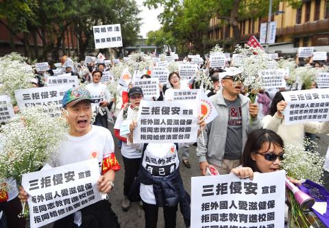 “Other than the emphasis on AIDS, many of the demands are basically the same [as previous protests against same-sex marriage],” said Lee Ching-ya (李靜亞), a protester previously observed speaking at Coalition for the Happiness of Our Next Generation rallies who said he was an alliance volunteer.