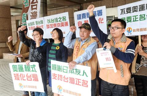 TSU officials and members of the party’s youth department staged a demonstration in front of the Sports Administration’s office in Taipei, holding placards that said: “Taiwan is Taiwan,” “We are not Chinese Taipei,” “Down with ‘Olympic model,” “Rectify the name to Taiwan now” and “Down with Sports Administration, stop belittling Taiwan.”