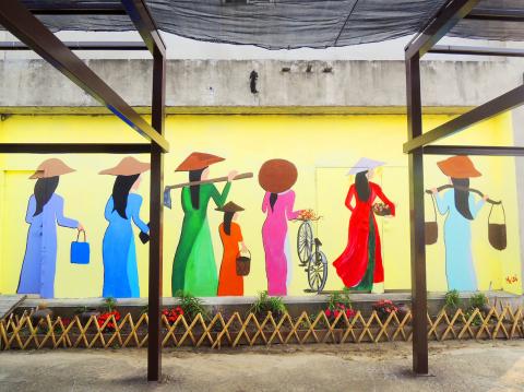Images of the lotus pond, various national flags and landmarks, such as Taipei 101, Malaysia’s Petronas Towers and Thailand’s Wat Arum, are displayed on the walls, as well as depictions of immigrant women working in a variety of professions.