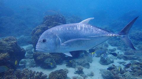 An online video showing a man catching a giant trevally fish in Pingtung County’s Hengchun Township (恆春) has sparked debate between divers and recreational fishermen.