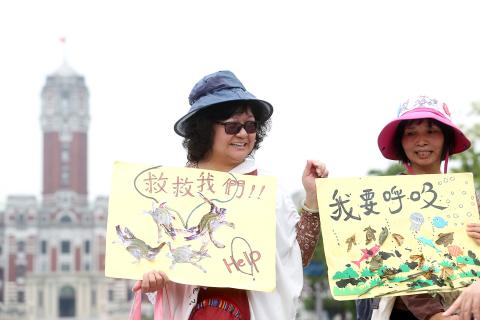 About 100 people yesterday gathered near the Presidential Office in Taipei, calling for the government to protect coastal algal reefs that could be endangered by the planned construction of a natural gas processing plant in Taoyuan’s Datan District (大潭).