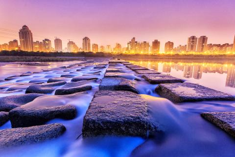 Transformed by the red glint of dawn, the concrete wave breakers in the middle of Hsinchu County’s Toucian River (頭前溪) are a favorite subject for local photographers.