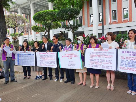 A coalition of education groups yesterday rallied in front of the Ministry of Education in Taipei to protest the ministry’s appointment of “fake” parents to its curriculum guidelines review committee for the 12-year national education system, saying that the appointments have created conflicts of interest.