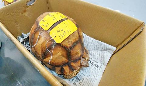 The largest of the three tortoises found on Sunday measured 41cm, giving it an estimated value of NT$1.24 million, while the others measured 26cm and 24cm respectively, putting their combined value at about NT$1.5 million, customs officials said.