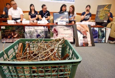 Taiwan Society for the Prevention of Cruelty to Animals executive director Connie Chiang (姜怡如) said the group has found that monkeys and stray dogs were caught in steel snares, resulting in broken limbs or starvation.
