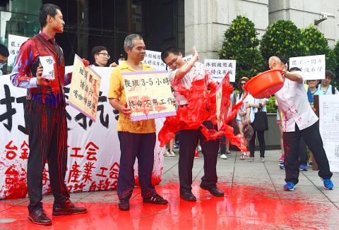 Regulations allow exploitative overtime hours to be imposed on transportation workers, labor groups said yesterday in a protest outside the Ministry of Transportation and Communications building in Taipei on the one-year anniversary of the China Airlines strike.