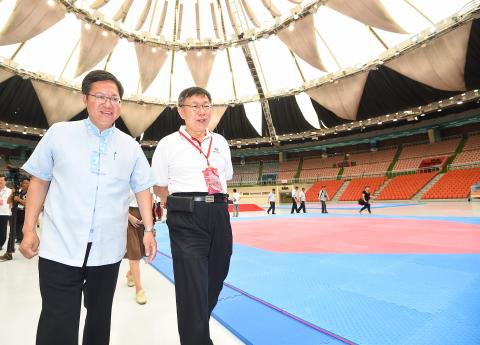Accompanied by Taoyuan Mayor Cheng Wen-tsan (鄭文燦), Ko visited the National Taiwan Sport University (NTSU) Arena’s swimming pool and water polo facilities, the track and field venue at Ming Chuan University’s Taoyuan campus and the taekwondo venue at the Taoyuan Arena.