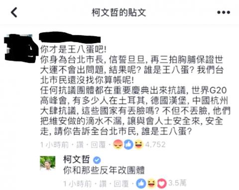 “You are the bastard. Being the mayor of Taipei and confidently vowing that nothing will go wrong during the Universiade, but what was the result? Who is the bastard now? We the residents of Taipei had not even asked you to pay for it,” the comment read.