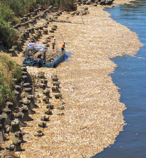 The bureau said it set up netting and floating blocks near the Bailing and Zhongshan bridges to prevent the dead fish washing downriver and was working with the Water Resources Agency to remove the dead fish.