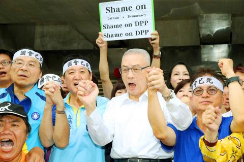 KMT Chairman Wu Den-yih (吳敦義) on Tuesday night visited the three lawmakers, saying that he “sympathizes with them and supports their hunger strike.”