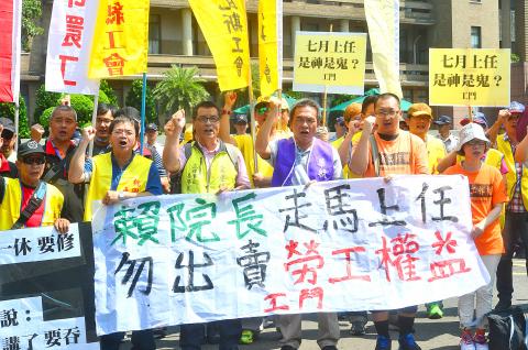 Premier William Lai’s (賴清德) second day in office began with two consecutive labor rights protests outside the Executive Yuan yesterday morning, with one asking the government to allow blue-collar migrant workers the right to switch employers and the other demanding that the government not side with businesses if it changes the regulations regarding working hours.