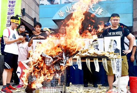 Dozens of advocates and people affected by land expropriation parodied a religious ceremony and burned paper offerings to President Tsai Ing-wen (蔡英文), Premier William Lai (賴清德), Kaohsiung Mayor Chen Chu (陳菊), Taichung Mayor Lin Chia-lung (林佳龍) and Taoyuan Mayor Cheng Wen-tsan (鄭文燦), who they said were “ghost kings and queens” responsible for inappropriate seizure of properties and the victimization of residents.