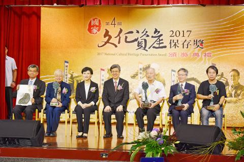 Vice President Chen Chien-jen (陳建仁) and Minister of Culture Cheng Li-chiun (鄭麗君) on Saturday marked National Cultural Heritage Day by commending people and groups that contributed to the cultural heritage conservation in a ceremony at the Taichung Cultural and Creative Industry Park.