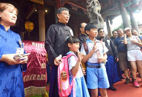 Ko and Yeh took part in the Confucius Temple’s annual ceremony to mark Confucius’ birthday, the first time Ko has attended the traditional ritual since he took office three years ago, and the men had a brief exchange.