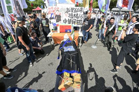 Students and members of pro-Taiwanese independence groups yesterday held a “funeral” in Taipei, where they performed last rites for an effigy representing the “corpse” of the Republic of China (ROC), rejecting official Double Ten National Day celebrations and calling for the establishment of the nation of “Taiwan.”