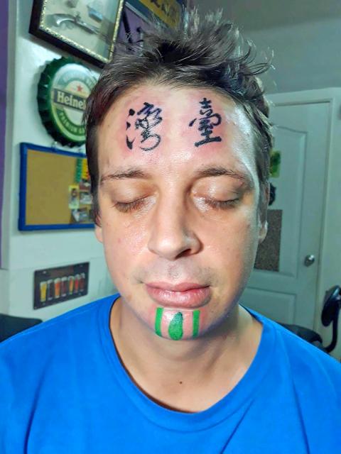 A Briton living in Kaohsiung has become the talk of the town after appearing in public yesterday with the Chinese characters for “Taiwan” tattooed on his forehead, saying that he regretted having had it done while intoxicated.