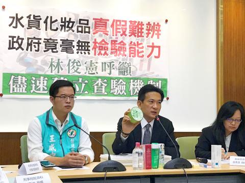 Democratic Progressive Party (DPP) Legislator Lin Chun-hsien (林俊憲) and DPP Taipei City Councilor Wang Wei-chung (王威中) yesterday urged the government to establish an inspection mechanism to protect consumers from counterfeit cosmetic and personal care products disguised as gray market goods.