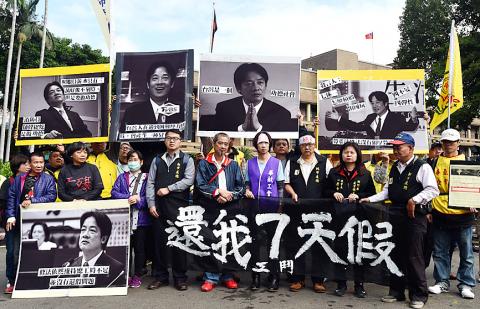 Several labor rights groups yesterday protested a draft amendment to the Labor Standards Act (勞動基準法) and demanded the reinstatement of seven national holidays, while Premier William Lai (賴清德) reiterated that labor rights would be protected by the changes.
