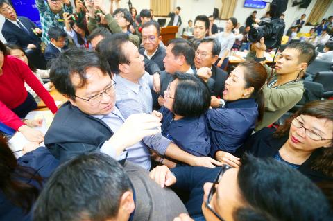 Earlier, during a scheduled daytime meeting, lawmakers scuffled with each other and a speaker was shoved from the podium before the meeting adjourned at 6:30pm.