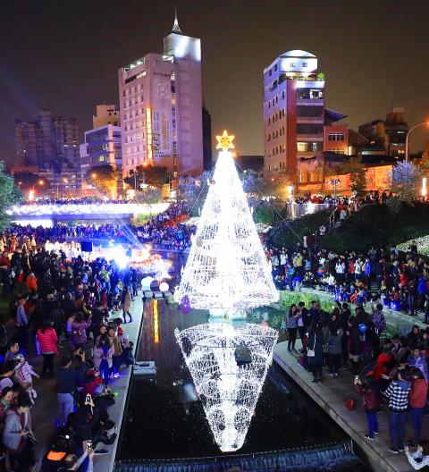 Saturday night saw the lighting of Taiwan’s first Christmas tree on water by Taichung Mayor Lin Chia-lung (林佳龍) on the waterfront of his city’s Willow River (柳川).