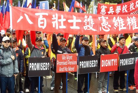 The 800 Heroes group of military veterans yesterday at a protest in Taipei vowed to defend the Constitution and their rights, after the Executive Yuan last week announced that it would soon present draft regulations governing military retirement pensions to the Legislative Yuan.